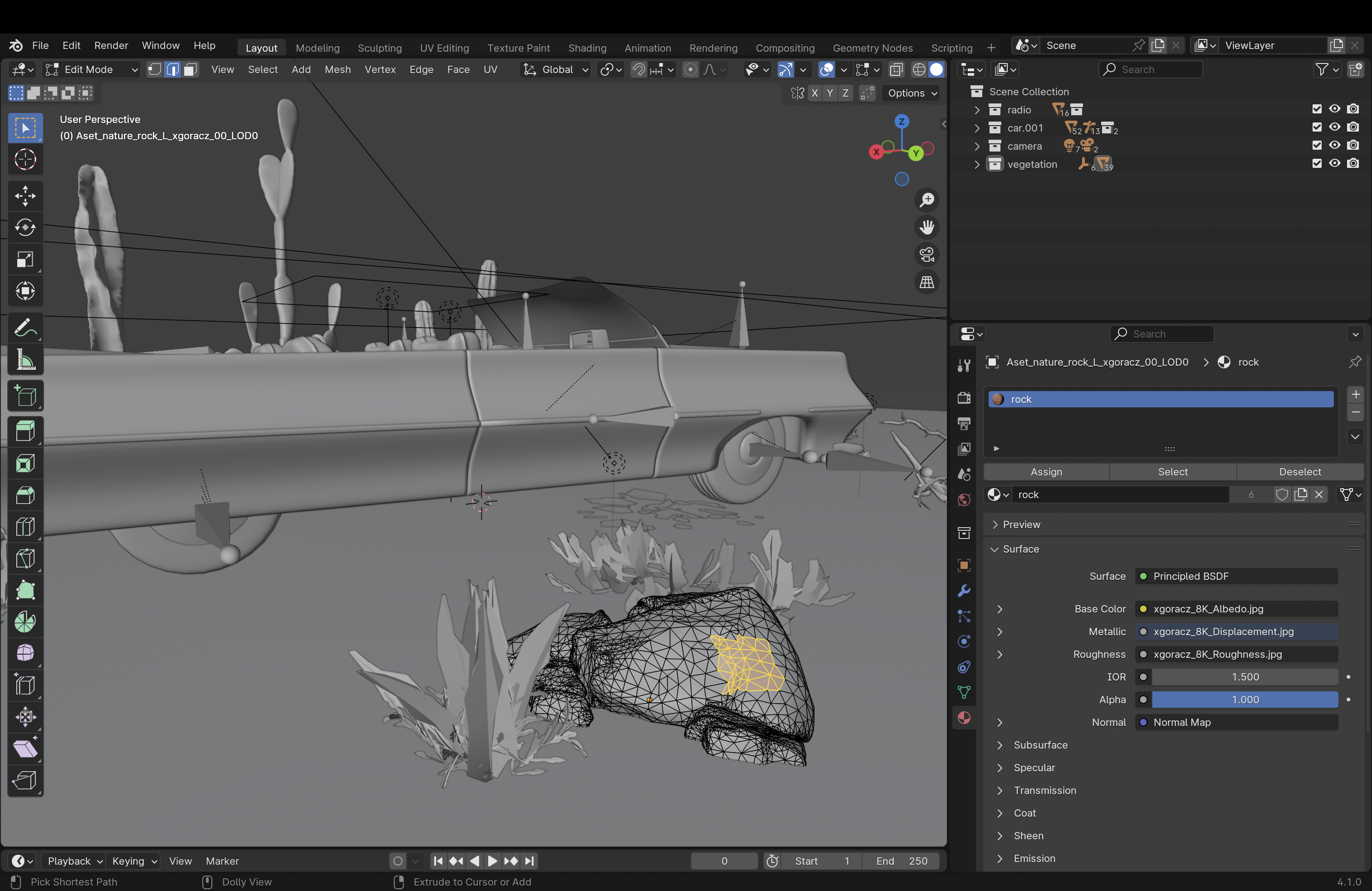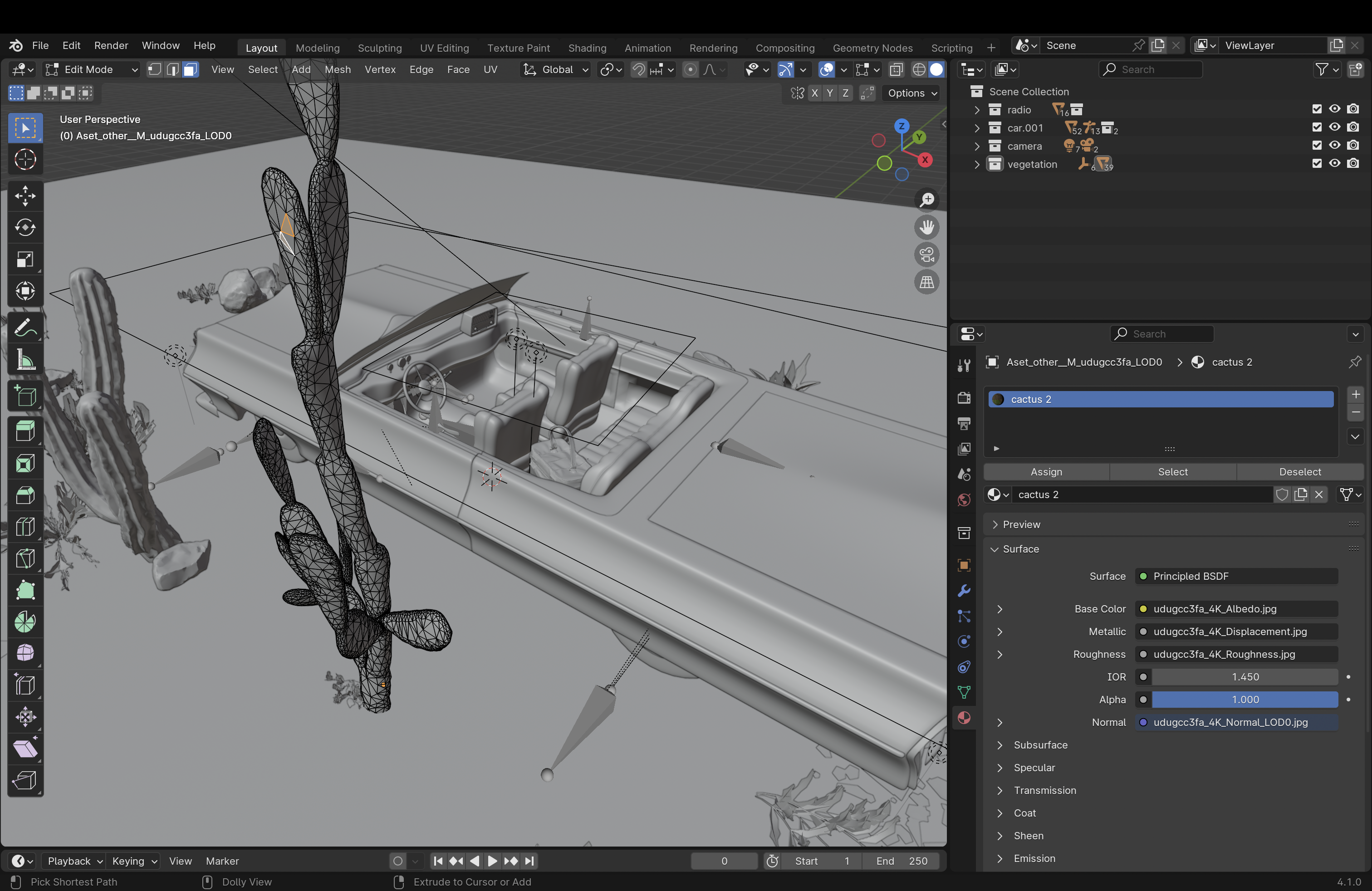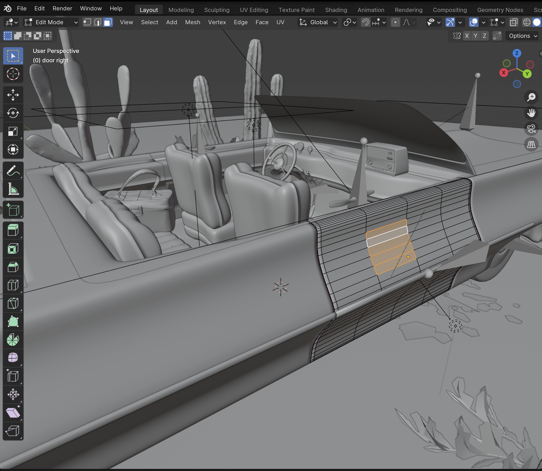 For this personal project, I designed a 3D desert environment in which a car is immobilized. The aim was to breathe life into the scene without resorting to human characters, integrating objects such as a bag and a radio to suggest a recent human presence. I started by modeling the desert landscape, sculpting the sand dunes and adding natural elements such as rocks and cacti. Next, I created a detailed car, ensuring that it blended harmoniously into the scenery. To enrich the visual narrative without characters, I placed objects such as a bag and a radio near the car, indicating recent human activity. After applying realistic textures to the various elements of the scene, I configured the lighting to reproduce the luminous ambience of a sunny desert. Finally, I rendered the scene in high resolution.